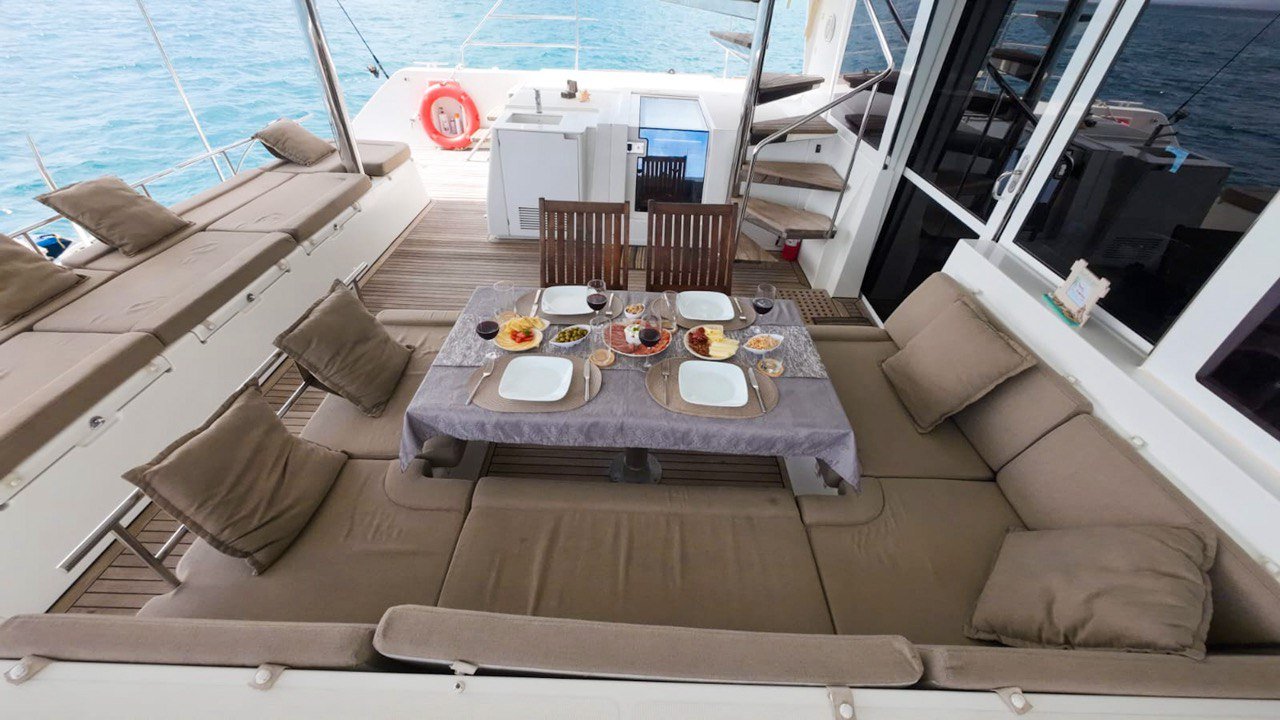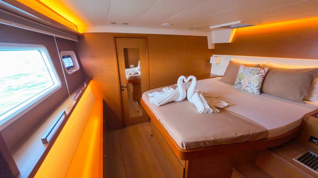 Embark on an unparalleled adventure aboard the majestic 2011 Lagoon 56L! With 56 feet of pure freedom, this catamaran is your personal haven in the middle of paradise. Imagine relaxing on the flybridge, enjoying an ice-cold cocktail while the wind caresses your skin and the breathtaking views of the islands take your breath away. And if the heat gets too hot, the air conditioning ensures a cool and cozy interior (in a responsible use, of course). But that’s not all; our kitchen is a feast for the senses. Here, the chef will surprise you with local delicacies such as fresh lobster and octopus, and don’t hesitate to make your special requests, we are here to please your palate! Your days will be full of excitement: discover secluded white sand beaches, glide over the waves on a paddle board or snorkel among colorful coral reefs that are home to amazing marine life. In addition, we offer you 4 comfortable cabins, each equipped with TV and private bathroom, and high-speed Internet access thanks to Starlink.